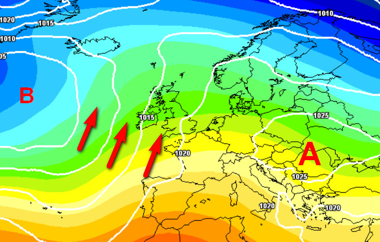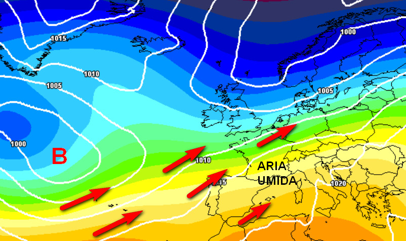 Si nota molto bene il richiamo di aria umida da sud-ovest verso l’Europa centrale e l’Italia; aria molto mite che concentrerà le piogge essenzialmente al nord e sul Tirreno. Lungo il versante adriatico, al sud e sulle Isole avremo invece una fase molto mite ed asciutta.