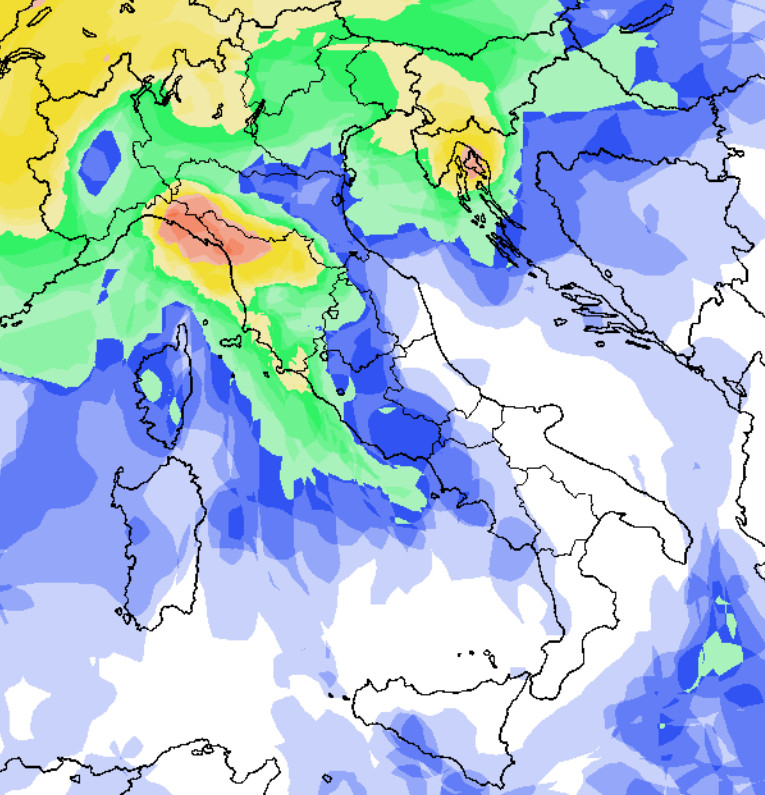Come anticipato, piogge concentrate soprattutto al nord, specie sulla Liguria centro-orientale, ma anche sul medio e alto Tirreno. Nevicherà solo sulle Alpi a quote piuttosto elevate. Notate inoltre la probabilità di pioggia praticamente nulla al sud e molto bassa sulla Sardegna, dove avremo temperature superiori alla media del periodo.