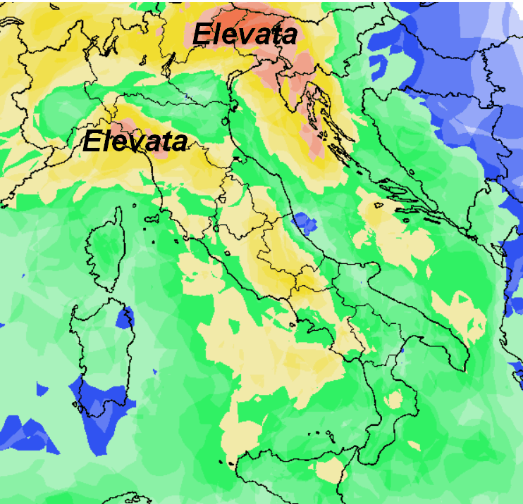 Le zone che riceveranno i maggiori apporti di pioggia saranno quelle sopravvento al flusso portante da sud-ovest, ovvero la Liguria, l’alta Toscana ed il nord-est; su queste regioni avremo una probabilità di pioggia ELEVATA. Una probabilità di pioggia MEDIO-ALTA sarà presente lungo il Tirreno e nelle aree interne del centro, per il resto vigerà una probabilità di pioggia MEDIA o addirittura BASSA dove vedete il colore blu.