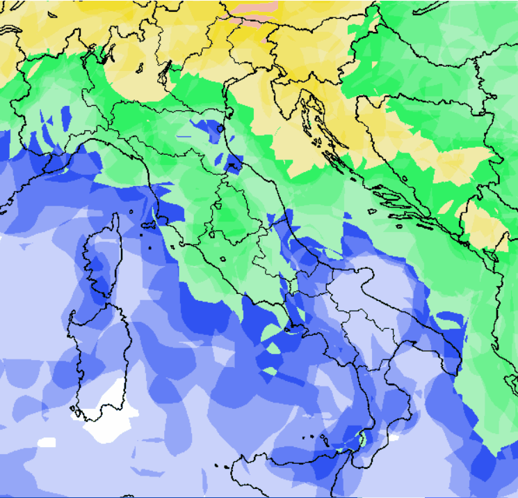 Probabilità di pioggia più ELEVATA sul settore alpino centro-orientale ed il nord-est, MEDIA sul restante settentrione, l’alto Tirreno e le aree interne. Sul resto d’Italia si farà sentire l’azione di una zona anticiclonica posta sul nord Africa che imporrà una probabilità di pioggia più BASSA, se non del tutto NULLA dove vedete il colore bianco sulla mappa.