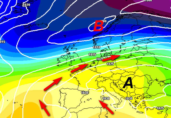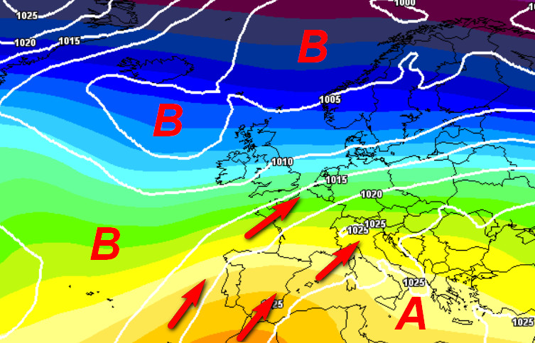 Notiamo un cambiamento radicale di configurazione rispetto a ciò che sta accadendo attualmente. L’alta pressione tenderà ad indietreggiare verso sud e si posizionerà con un massimo in prossimità del Mar Ionio. La nostra Penisola e gran parte dell’Europa centro-occidentale verranno interessate da un flusso di correnti decisamente più miti ed umide da sud-ovest che farà aumentare la nuvolosità al nord e sul Tirreno con anche alcune precipitazioni.