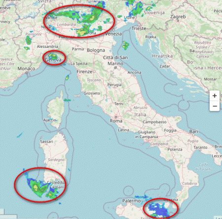 Rovesci o brevi temporali sono in atto sull’arco alpino centro-orientale, in Liguria, nel sud della Sardegna e sull’est della Sicilia. Sono "spie" di una situazione che ancora per oggi verrà governata da una moderata instabilità atmosferica sul nostro Paese.