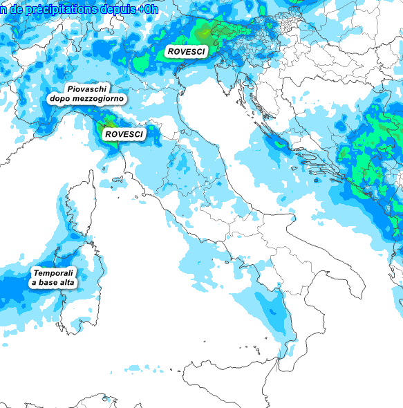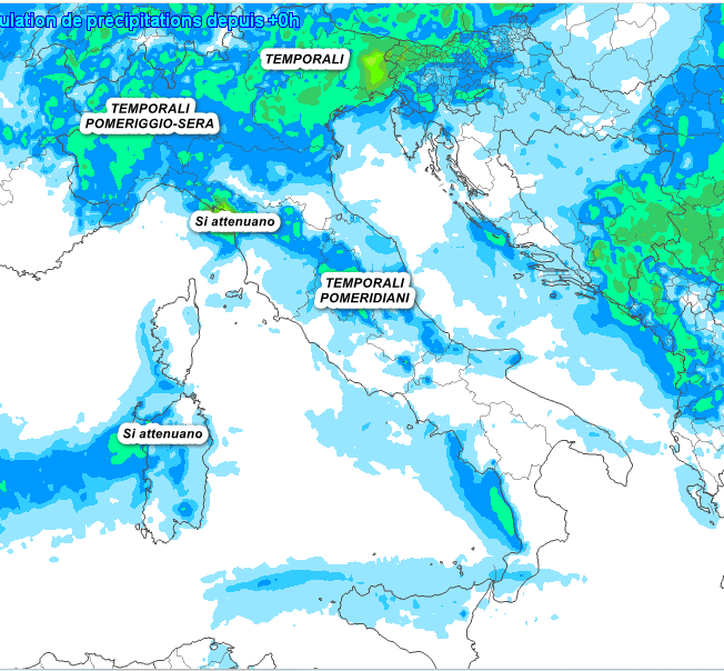 Vediamo la sommatoria delle precipitazioni attese in Italia fino alle ore 14 di oggi pomeriggio: