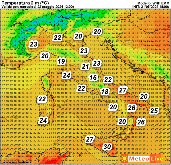 Valori nel complesso gradevoli su quasi tutta l’Italia. Segnaliamo 30° in Sicilia, 26-27° su Puglia e Lucania.