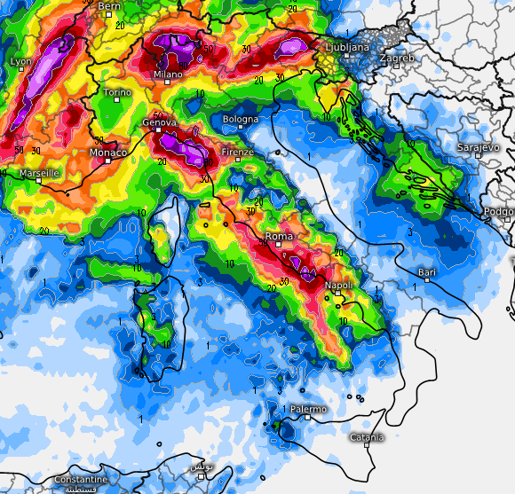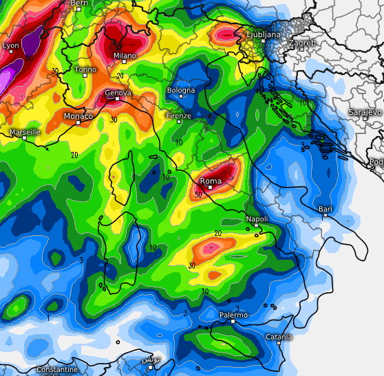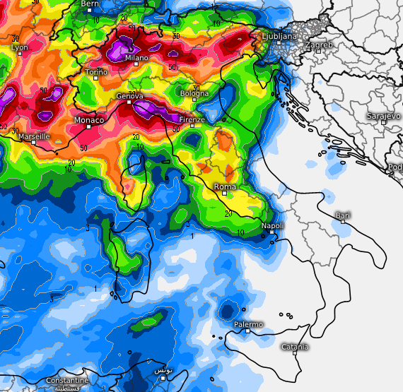 Un po’ meno abbondanti i fenomeni previsti dal modello GEM, che non sfondano oltre il Lazio, ma rincarano la dose lungo la fascia prealpina e pedemontana del nord e tra Levante ligure ed alta Toscana: