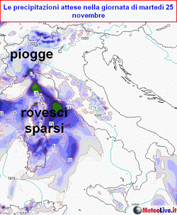 L'alta pressione si indebolisce e consentirà gradualmente l'ingresso di aria più umida da ovest con rischio sempre più concreto di precipitazioni sui versanti nord-occidentali da martedì. Le piogge tra mercoledì e giovedì coinvolgeranno poi tutta la Penisola, incerta invece l'evoluzione dell'affondo perturbato atteso per l'ultimo settimana di novembre. Si nota peraltro l'accelerazione delle correnti occidentali per i primi giorni di dicembre con anticiclone sull'Italia e forti venti sul nord Europa.