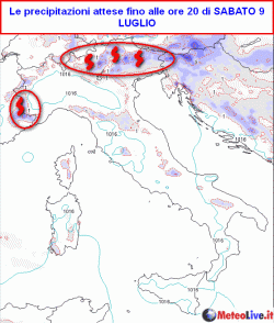 La mappa a lato inquadra la sommatoria delle precipitazioni attese fino alle ore 20 della giornata odierna, sabato 9 luglio.