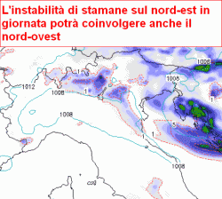 Oggi schiarite su gran parte del Paese ma ancora instabilità sul nord-est, in parziale estensione anche al nord-ovest nel pomeriggio. Martedì arrivo di nuovi temporali in giornata al nord, mercoledì soprattutto tra nord-est e regioni centrali, scarsamente coinvolto il sud. Clima gradevole. Da giovedì tendenza a graduale miglioramento e almeno sino a domenica bel tempo con rialzo delle temperature.