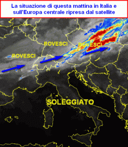 L’immagine satellitare di questa mattina è molto interessante; l’arco alpino si comporta da "spartivento" e divide due climi molto diversi, se non addirittura opposti. A nord delle Alpi dominano piogge, rovesci e aria più fresca (frecce blu), mentre sulla nostra Penisola resiste un campo di alta pressione che garantisce condizioni climatiche estive.