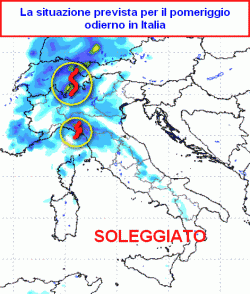 La frontolisi parziale del corpo nuvoloso a contatto con l’alta pressione afro-mediterranea "spaierà" i fenomeni che si frammenteranno in mille rivoli. Ciò renderà la previsione molto complessa per la giornata odierna, riassunta comunque nella seconda cartina a lato.