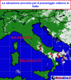 Alta pressione in rimonta sull'Italia e sul bacino centro-occidentale del Mediterraneo. Un blando ritorno di aria più fresca interesserà però il meridione, dove è attesa la nascita di qualche nucleo temporalesco, specie nelle zone interne.
