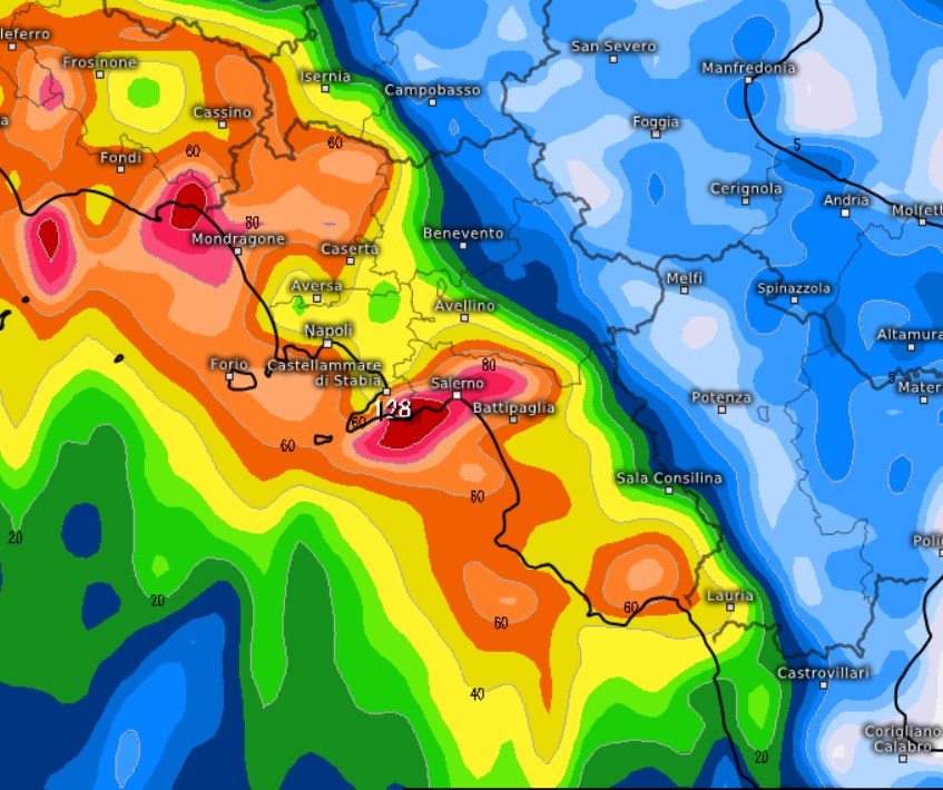Segnaliamo che gli ultimi aggiornamenti di sabato mattina hanno aumentato sensibilmente la quantità di pioggia stimata sulla Campania e sul basso Lazio (fino alle porte di Roma), con cumulate di oltre 80-90mm e possibilità di nubifragi: