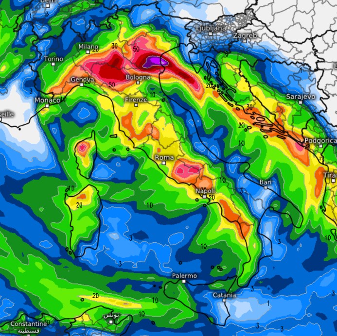 Si notano gli accumuli più vistosi, sin oltre 50mm (in rosso-violaceo) sul Veneto, la bassa Lombardia e l’Emilia occidentale, comunque rilevanti gli apporti precipitativi anche lungo tutta la dorsale appenninica del centro che si affaccia sul Tirreno e sulla Campania, quasi a secco le coste del medio e basso Adriatico.