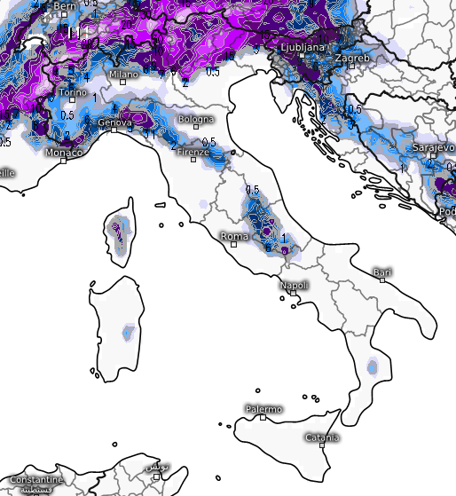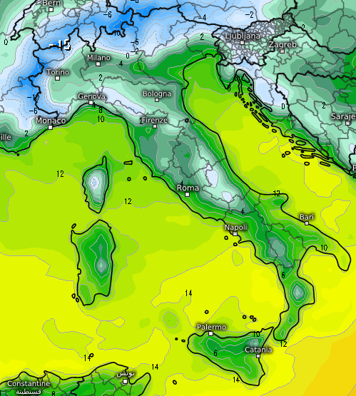 Sull’Appennino centrale neve soprattutto sull’Abruzzo oltre gli 800-1.200m, più avaro il modello sul resto della dorsale appenninica, del resto le temperature previste all’alba di domenica non inducono a pensare a chissà quali nevicate a quote basse sull’Italia centrale e anche in Valpadana si andrà dai 2 di Torino e Milano ai 4°C di Venezia: