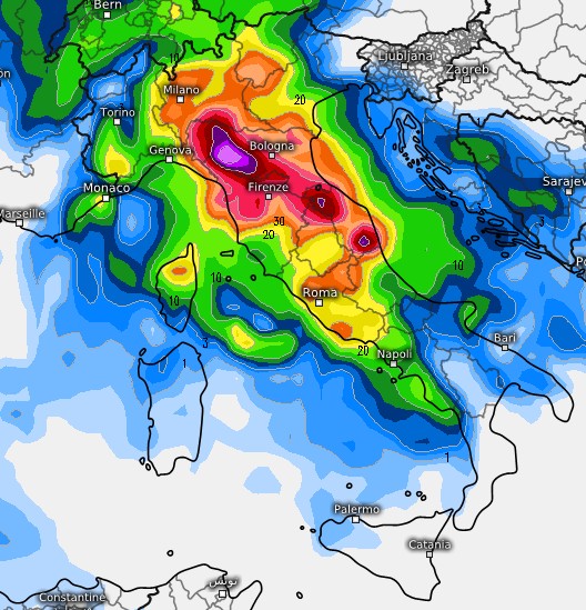 La seconda mappa mostra le precipitazioni attese nella giornata di domenica 24 agosto, quando ormai il ciclone si sarà ampiamente formato. I fenomeni che vedete sotto non tengono conto di quelli che il settentrione già sperimenterà tra il 21 ed il 23, che risulteranno già particolarmente abbondanti su gran parte delle regioni, specie tra basso Piemonte, bassa Lombardia centro-orientale, Liguria, Veneto, Friuli Venezia Giulia e Trentino. In questa fase, come vedete, sarà il turno ancora della Lombardia, ma soprattutto dell’Emilia, della Toscana interna, delle Marche, del nord dell’Umbria e più in generale di quasi tutte le regioni centrali, tranne il basso Abruzzo e purtroppo la Sardegna: