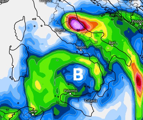 Nella terza mappa, prevista tra lunedì 25 e martedì 26 il vortice si staglierebbe sul meridione e sul medio Adriatico, portando piogge particolarmente abbondanti, oseremmo dire pericolose, sull’Abruzzo e comunque generose su gran parte del meridione (da notare che nella notte su lunedì 25 Romagna e Marche potrebbero sperimentare piogge particolarmente abbondanti e temporali):