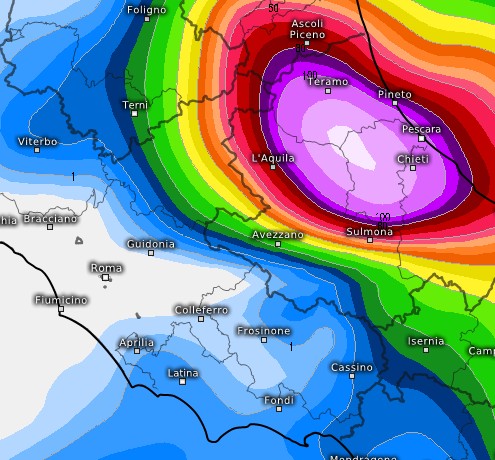 E’ opportuno uno zoom sull’Abruzzo per capire quali località verrebbero maggiormente colpite, come vedete in viola ci sono accumuli anche superiori ai 100mm in 24 ore tra Teramano, Chietino, Pescarese e Aquilano: