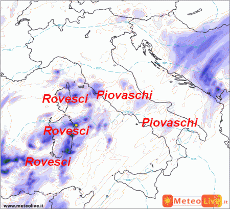 Temporali nei pressi della Sardegna; rovesci su quasi tutto il centro ad eccezione dell’alta Toscana; piogge anche al sud ad eccezione della Sicilia e le aree estreme, bello al nord. Temperature piuttosto fresche specie al nord e al centro stante il rinforzo di correnti nord-orientali, stazionari i valori al meridione.