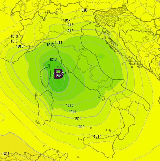 Ecco invece la posizione del vortice al suolo (ma sarà presente ovviamente anche in quota) che si andrà isolando sull’Italia centrale tra sabato sera e domenica 9 novembre, abbracciando quasi tutta la Penisola: