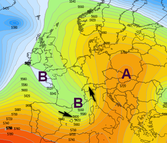 Qui una mappa barica prevista per la serata di venerdì 7 novembre in quota a 5500m secondo il modello GFS, dove si nota la saccatura sfondare sulle Alpi occidentali, scacciando l’alta pressione:
