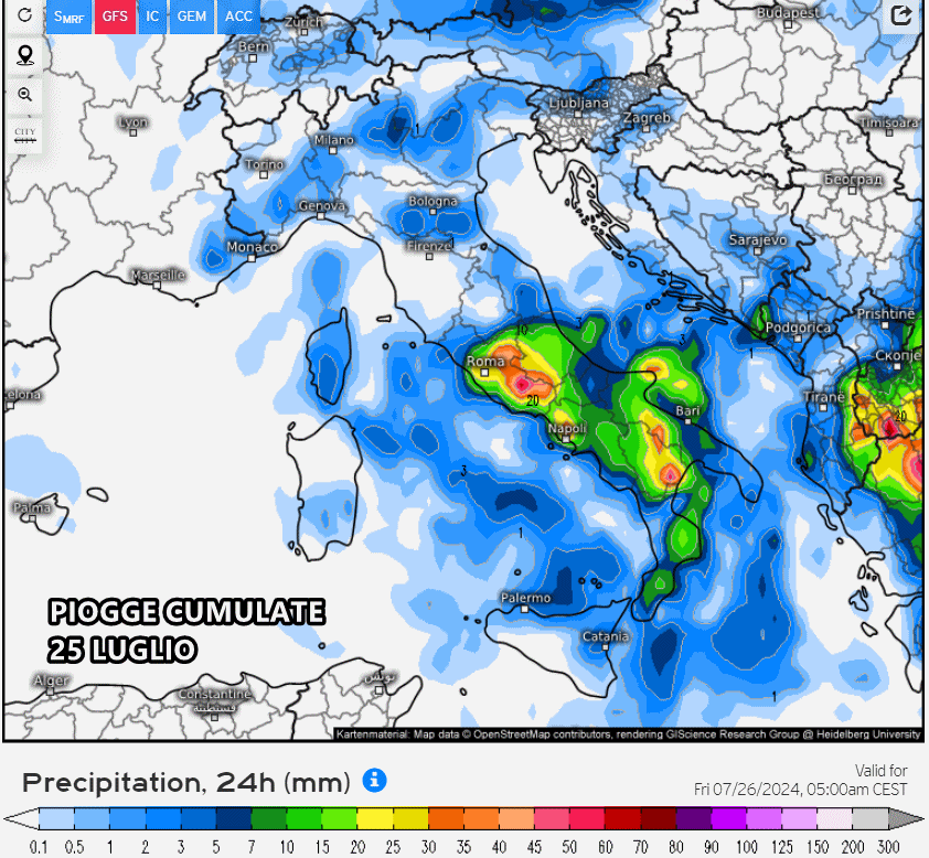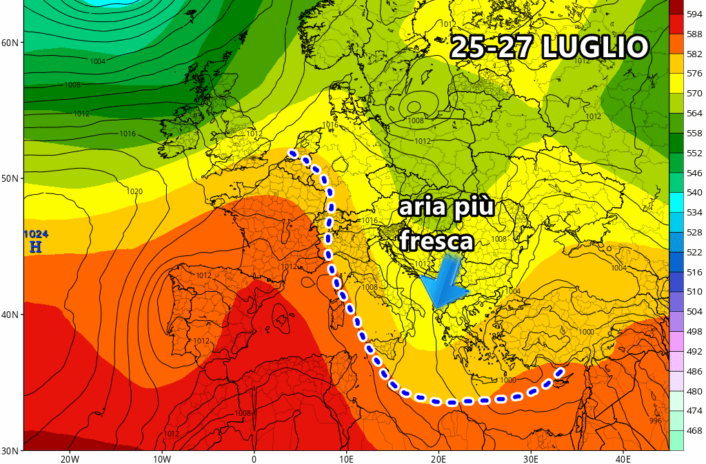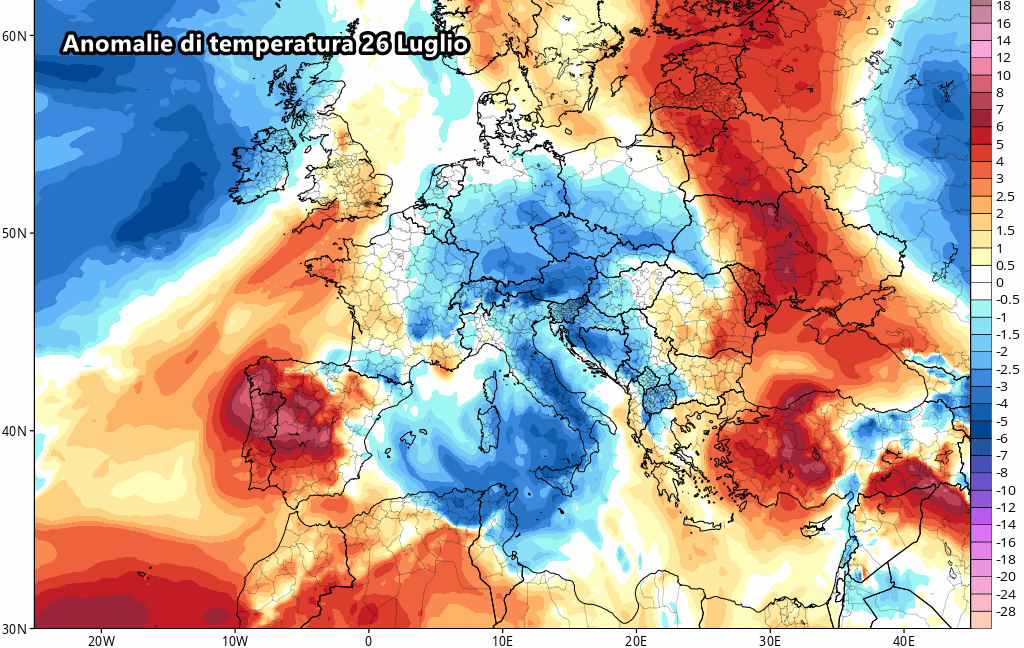 Questa eventuale ondata di fresco, prevista tra 25 e 26 Luglio, sarebbe sufficiente per abbattere la colonnina di mercurio di oltre 8-10°C rispetto ai valori attuali. Non solo potremmo rientrare verso le medie del periodo, ma addirittura c’è la possibilità di scivolare sotto-media di un paio di gradi, soprattutto al centro e al sud. Insomma questa irruzione fresca proveniente dai Balcani non passerebbe inosservata!