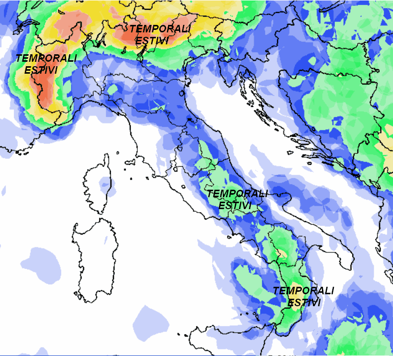La cartina mostra la probabilità maggiore di temporali estivi pomeridiani su Alpi, Prealpi e zone interne dell’Italia centro-meridionale, ma con basso rischio di sconfinamenti verso le pianure e le coste. Su tutte le altre regioni sole dardeggiante ed assenza quasi completa di fenomeni.