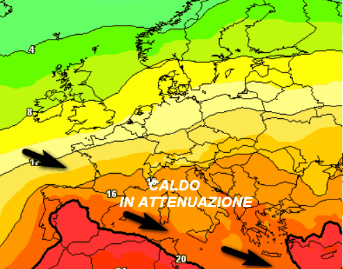 E’ innegabile la ritirata verso sud del caldo intenso in favore di una calura nettamente più sopportabile da nord a sud. Da notare anche le maggiori infiltrazioni fresche dall’Atlantico (frecce nere) che mineranno la solidità dell’alta pressione. Tutto ciò si ripercuoterà con un aumento dell’attività temporalesca in Italia, come mostra questa mappa valida sempre per mercoledi 4 settembre: