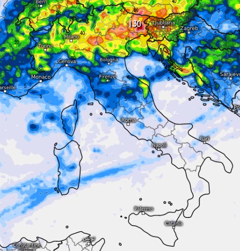 Qui una mappa riassuntiva delle precipitazioni previste dal modello europeo sino a giovedì 13, notare il picco di 130mm sul nord-est: