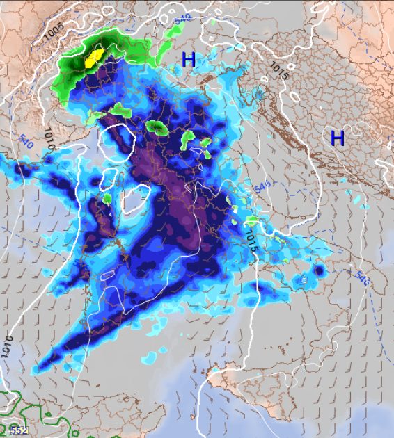 Gli accumuli precipitativi risulteranno abbondanti dapprima sul nord-ovest e la Toscana, poi sul nord-est, l’Umbria e il Lazio, il tutto accompagnato da venti molto sostenuti dai quadranti sud orientali.