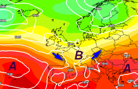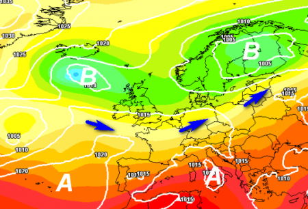Tutto questo perchè una grande figura depressionaria situata sul nord del Continente abbraccerà anche il settentrione, con il suo flusso di correnti fresche ed instabili in arrivo da ovest. Lo vediamo chiaramente qui sotto: