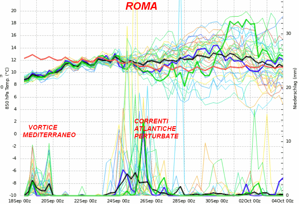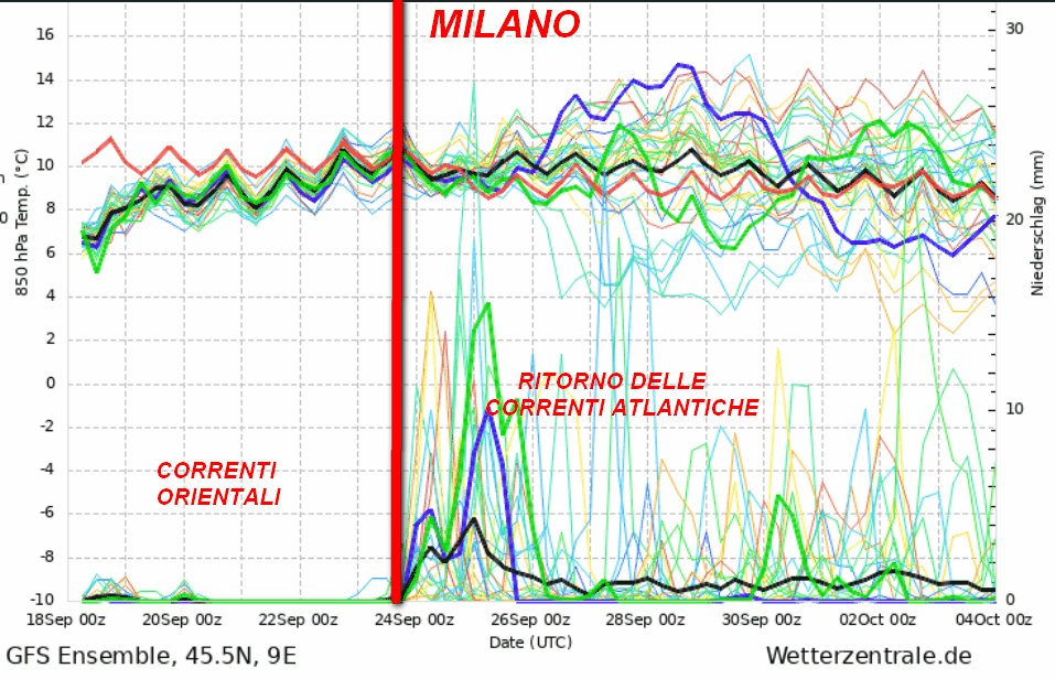 La fase relativamente asciutta imposta da un regime di correnti orientali dovrebbe durare fino a martedi 24 settembre. A seguire, brusca entrata delle correnti atlantiche con il ritorno del maltempo in un contesto termico incerto, ma abbastanza vicino alla media del periodo.