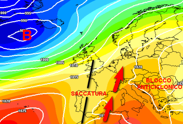Avremo in sostanza una situazione di blocco ad est, comandata da un’alta pressione sui meridiani centro-orientali europei ed una vasta saccatura che abbraccerà invece il settore occidentale del Continente. I blocchi ad est, se opportunamente collocati, sono fautori di potenziali eventi alluvionali sull’Italia, in modo particolare sul settore di nord-ovest, che si trova nel quadrante destro della saccatura, ovvero dove risale aria calda ed estremamente carica di vapore proveniente da sud.
