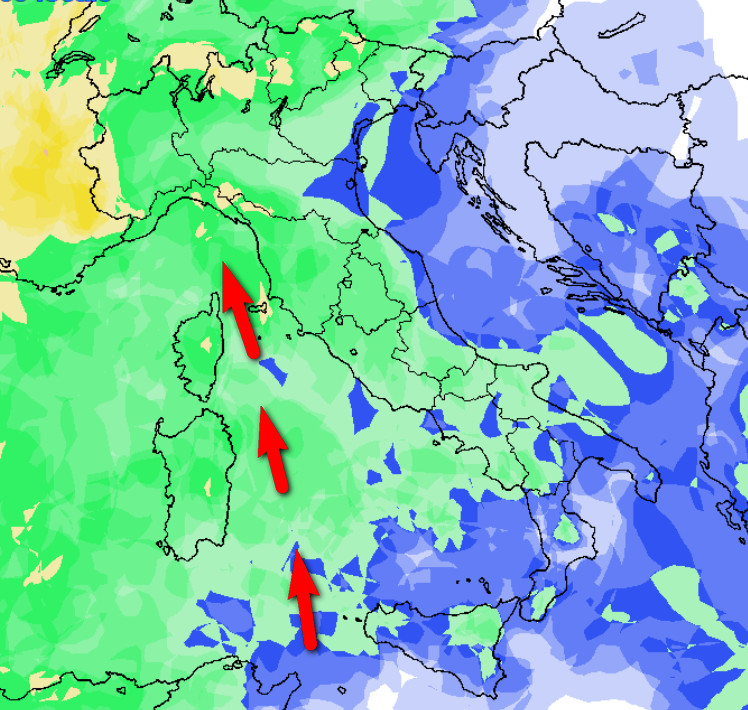 Si nota una probabilità di pioggia crescente da est verso ovest con punte massime proprio sul settore nord-occidentale dell’Italia. Le correnti di Scirocco sarebbero attive dal Tirreno verso il settentrione (frecce rosse) e potrebbero trasportare grossi quantitativi di aria umida, materia prima per piogge intense e persistenti sull’alta Italia.
