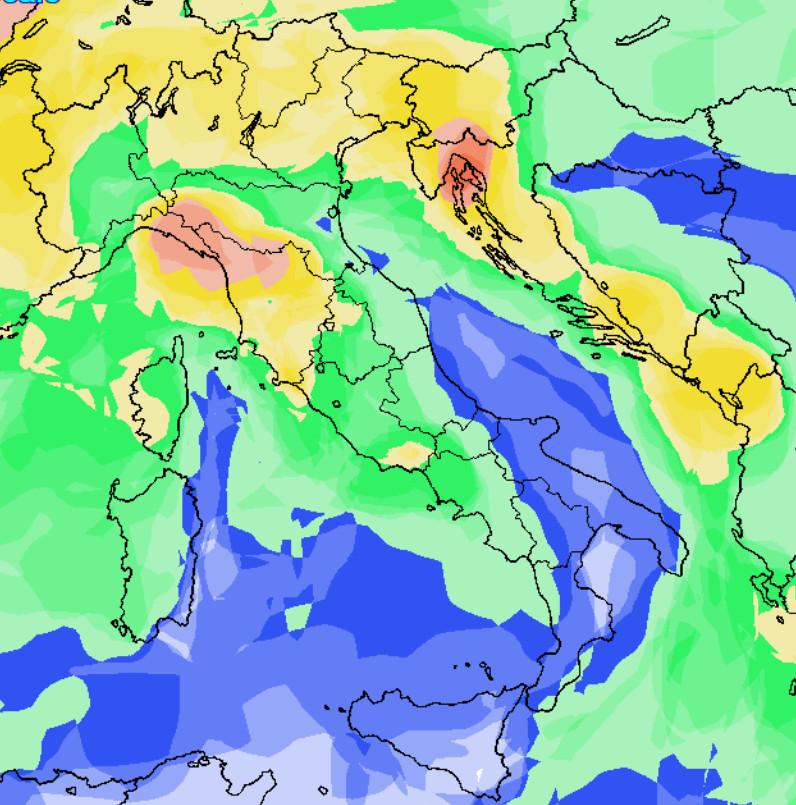 Le correnti fredde nord-occidentali verranno sostituite da aria più mite ed umida proveniente da sud-ovest messa in movimento da una vasta depressione presente sul vicino Atlantico. Le regioni esposte alle piogge, con questa situazione, saranno quelle settentrionali e le aree del centro, segnatamente il versante tirrenico. A tal proposito, ecco la mappa della probabilità di pioggia in Italia valida per la medesima giornata, ovvero domenica 24 novembre – In blu probabilità di pioggia bassa (sotto al 25%), in verde medio-bassa (fra 25 e 50%), in giallo medio-alta (fra 50 e 75%) e in rosso alta o molto alta” (oltre il 75%).