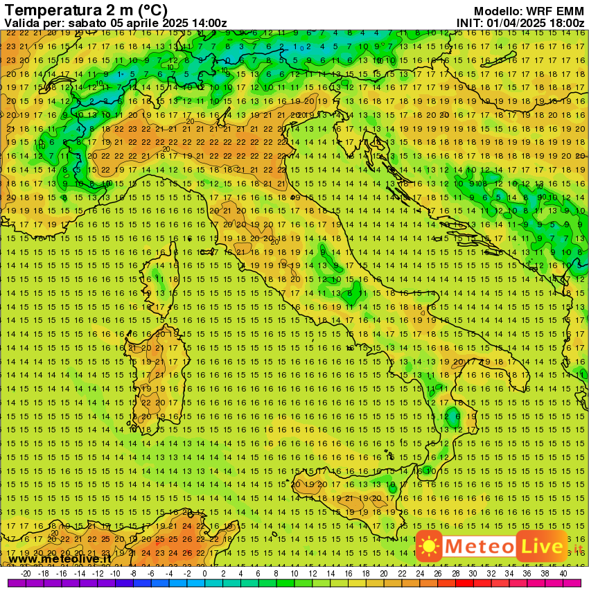 Questa breve parentesi fredda sarà preceduta da temperature superiori alla media del periodo che interesseranno l’Italia tra giovedi e sabato. Proprio sabato potrebbe essere una giornata “quasi calda” su alcune regioni italiane. La seconda mappa mostra i valori termici AL SUOLO attesi in Italia alle ore 16 di sabato 5 aprile – si consiglia di ingrandire l’immagine per avere un migliore riscontro visivo.