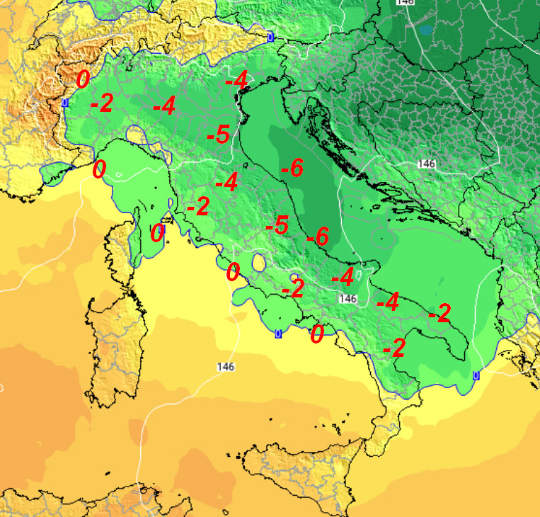 Resteranno escluse da questo abbraccio freddo le due Isole Maggiori, la Calabria ed i settori alpini in genere. In prossimità del medio versante adriatico sono attese punte al ribasso alla medesima quota attorno a -6°; tra -4 e -5° nelle aree interne del centro e sulla verticale della Valpadana centro-orientale.