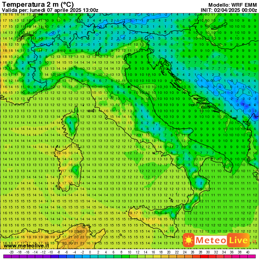 Osserviamo adesso lo SBALZO TERMICO che avremo 48 ore dopo. La terza mappa mostra le temperature AL SUOLO previste in Italia alle ore 15 di lunedì 7 aprile: