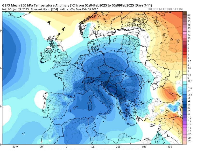 Come vedete, cambierà tutto. In Italia si prevedono anomalie al ribasso fino a 8° dove vedete la colorazione più scura. Insomma, l’inverno proverà ad uscire dal lungo letargo, proponendo situazioni termobariche più consone alla stagione fredda. Vedremo se ci riuscirà.
