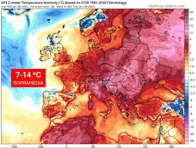 La giornata di martedi 28 gennaio è stata “terribile” dal punto di vista delle anomalie termiche sul Continente. Vi presentiamo una mappa che riassume gli esuberi termici a 1500 metri in Europa inerenti alla giornata in questione: