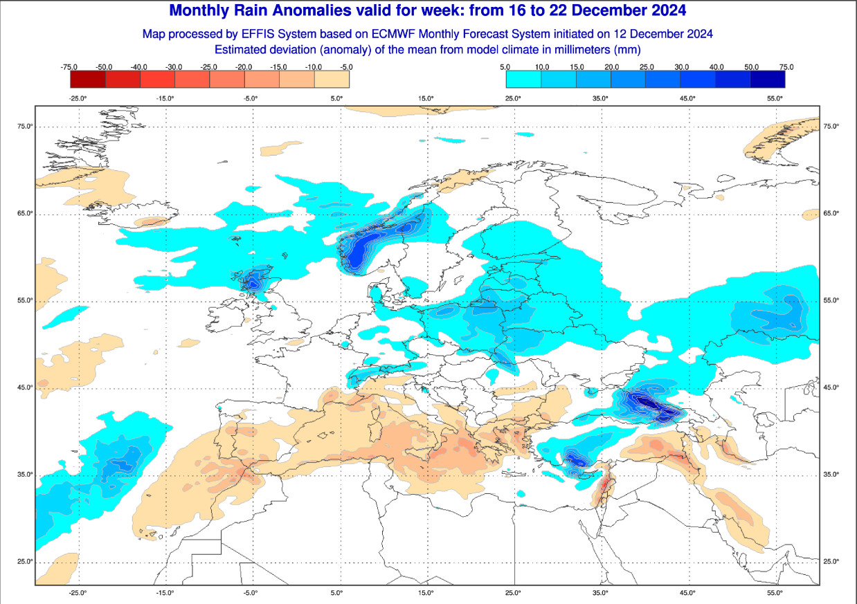 La terza cartina mostra le ANOMALIE PRECIPITATIVE attese in Europa nel lasso temporale compreso tra il 16 e il 22 dicembre: