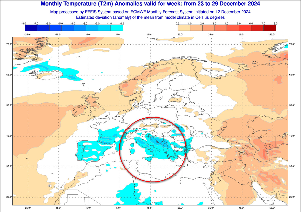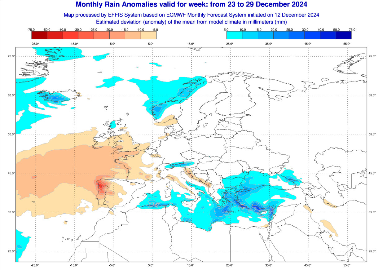 La quarta ed ultima mappa mostra le ANOMALIE PRECIPITATIVE previste in Europa nel lasso temporale compreso tra il 23 e il 29 dicembre:
