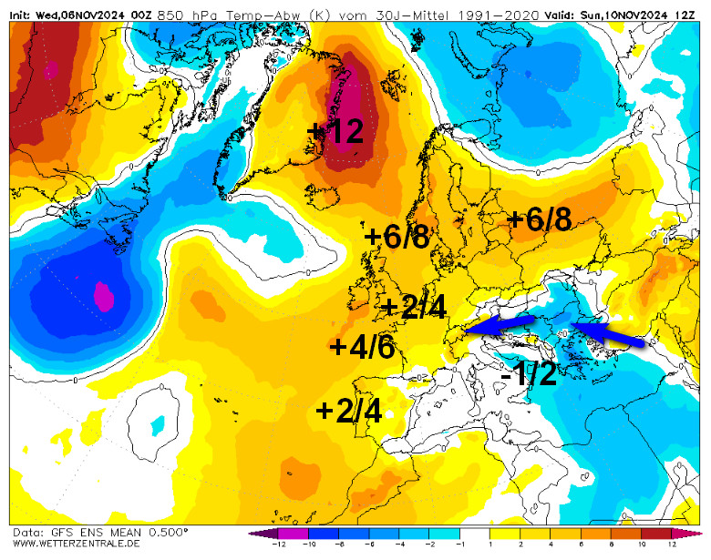 Nei prossimi giorni le temperature sull’Italia tenderanno progressivamente a calare sotto i colpi di una corrente orientale che durante la settimana prossima potrebbe dare vita alla prima ONDATA di FREDDO della stagione. In questa sede mostreremo la variazione delle anomalie termiche che avverranno sul nostro Continente nei prossimi 7 giorni, iniziando dalla giornata di venerdi 8 novembre: