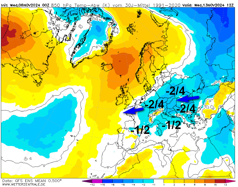 Osserviamo adesso cosa potrebbe succedere nell’arco della settimana prossima. La terza mappa mostra le anomalie termiche a 1500 metri attese in Europa nella giornata di mercoledi 13 novembre: