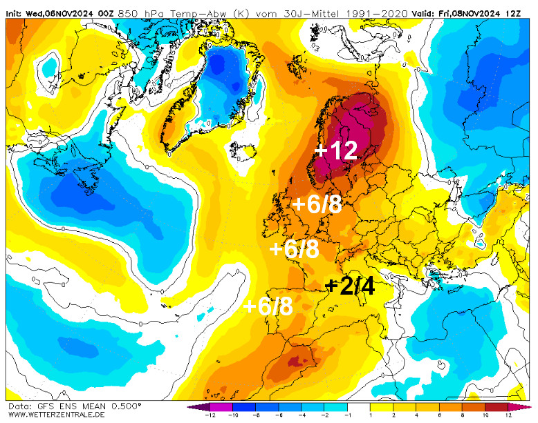 Ricordiamo che nelle cartine sono riportati gli scostamenti delle temperature a 1500 metri rispetto ai valori medi del periodo. Come si nota dalla prima mappa, nella giornata di venerdì sulla verticale italica le temperature risulteranno ancora più alte del normale tra 2 e 4°. Solo al meridione e sulla Sicilia avremo valori termici alla medesima quota attorno alla media. Ben più evidente sarà il sopra media termico sul resto d’Europa, addirittura fino a 12° di esubero in prossimità della Scandinavia.