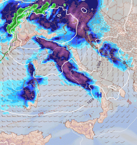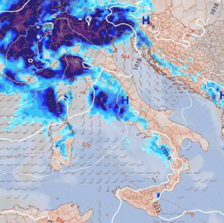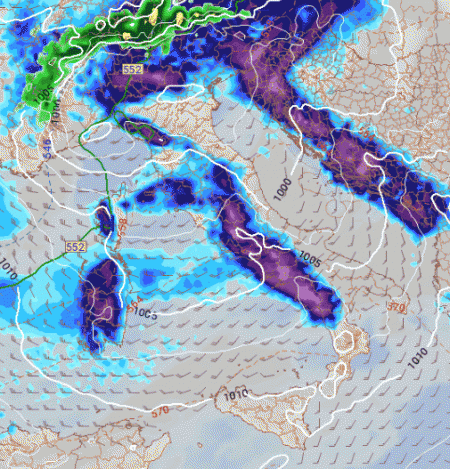 EVOLUZIONE: venerdì l’aria fredda si tufferà, come ormai accade raramente, dalla Valle del Rodano, ripresentandosi sul Mar Ligure come Libeccio freddo; si attiverà così una depressione al suolo in Valpadana, supportata da un vortice freddo anche in quota, in sfondamento dalle Alpi. Ci sarà cosi sul settentrione una recrudescenza del maltempo, con arrivo della neve a quote progressivamente più basse sul settore alpino (sin verso i 1500m entro sera). Ecco i fenomeni previsti in mattinata: