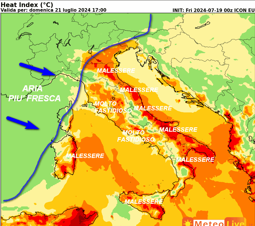 Questo invece è il disagio da caldo previsto in Italia alle ore 17 di domenica 21 luglio: