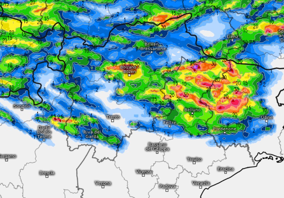 Vi mostriamo uno zoom sul nord-est perchè è qui che lunedì pomeriggio-sera si verificheranno i temporali maggiormente organizzati con rischio di grandinate e colpi di vento, soprattutto fra rilievi dell’alto Veneto e rilievi della provincia di Pordenone. I fenomeni tuttavia difficilmente raggiungeranno le pianure.