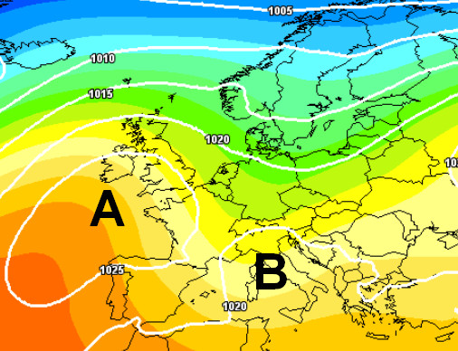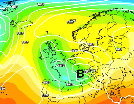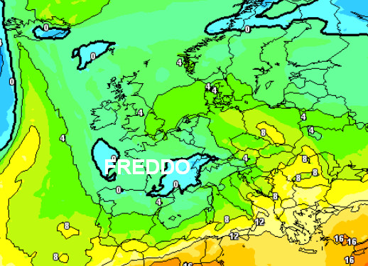 Notevole l’isoterma di 0° alla medesima quota sull’Europa occidentale, che potrebbe estendersi in parte anche ai settori alpini. Il tutto sarebbe accompagnato da una fase di maltempo che abbraccerebbe tutto il settentrione e parte del centro, come mostra la mappa sinottica attesa per il medesimo giorno: