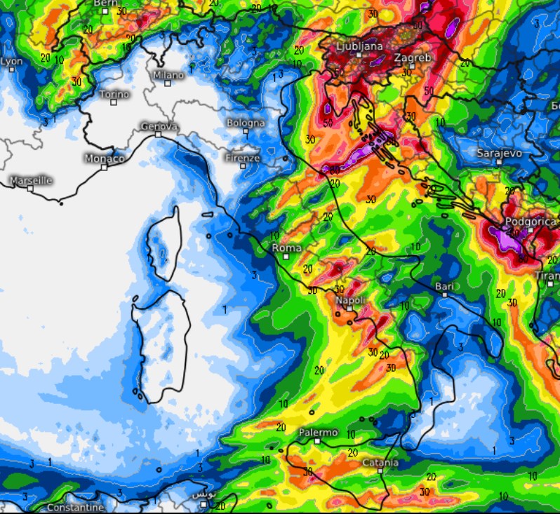 Lo vediamo molto bene da questa mappa tratta dal modello ICON, dove si nota anche un più scarso coinvolgimento di Piemonte e Valle d’Aosta rispetto alle altre regioni del nord:
