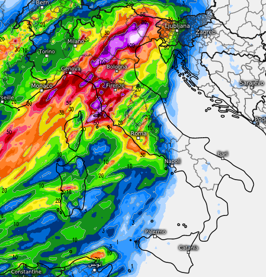 La giornata di domenica 8 settembre potrebbe essere una giornata pericolosa su diverse regioni italiane tra il nord e il centro Italia. Le mappe meteo segnalano accumuli superiori ai 100mm in poche ore sulle seguenti aree: Toscana, Liguria centro-orientale, Emilia-Romagna, sud-est Lombardia, Veneto e Friuli Venezia.
